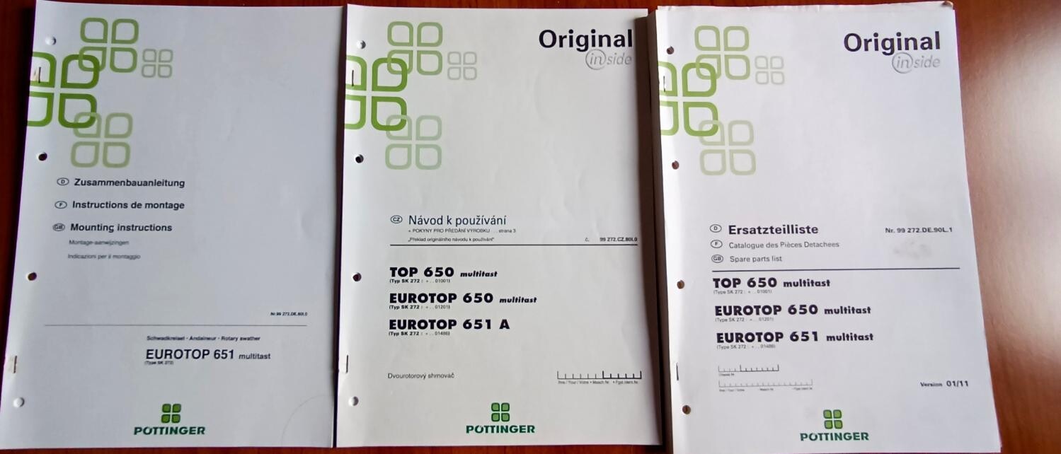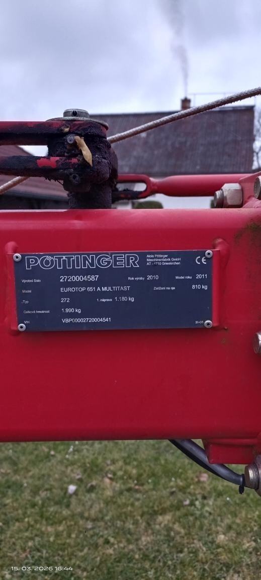 Nahrabovač Pöttinger Eurotop 651, rok výroby 2011 - pořizován na 15 ha. Od roku 2016 na výměře 70 ha a nyní již dvě sezony necháván jako záložní za čtyř-rotorový. Udržovaný stroj, ježděný pouze dvojí obsluhou - otec, syn. Hrabice všechny kompletní, rotory bez vůlí, bez úniků. Technického osvědčení.